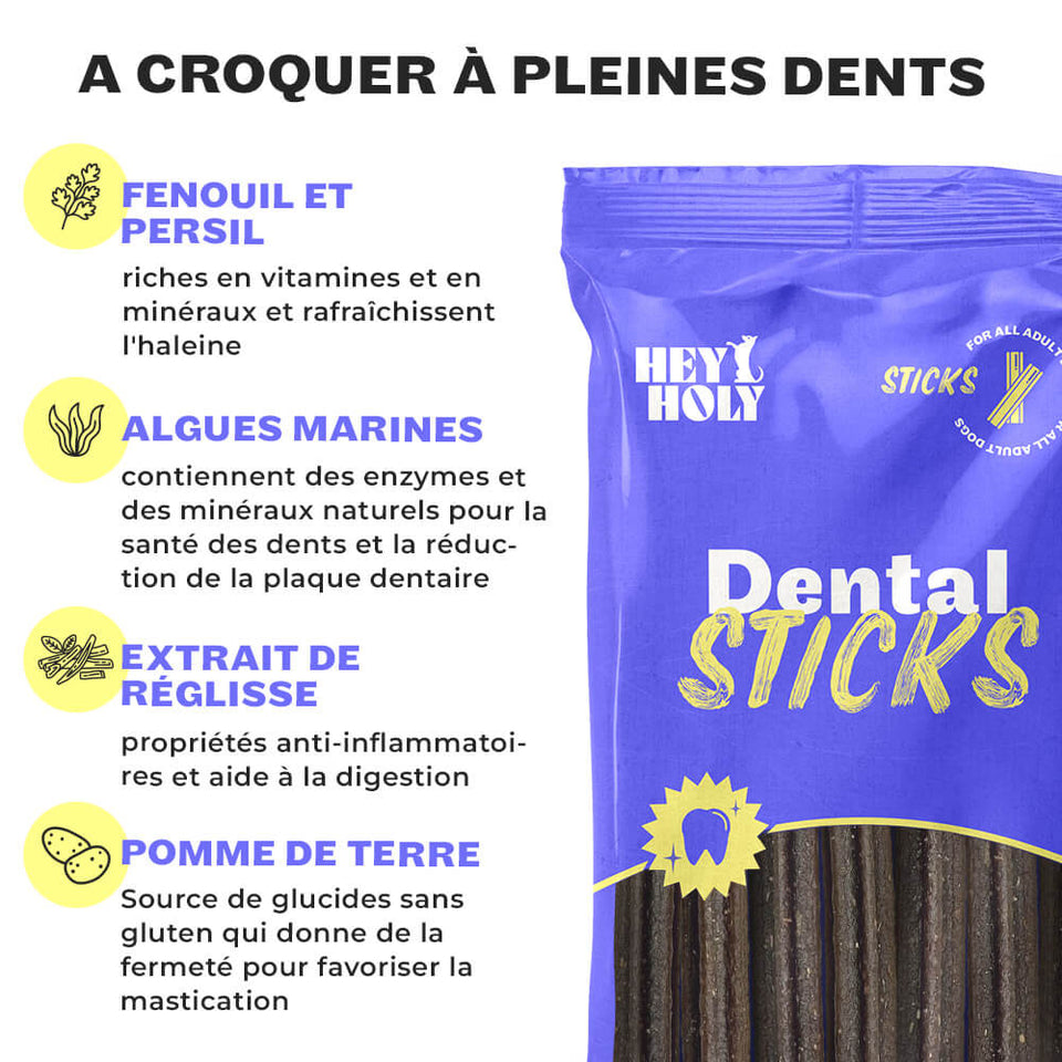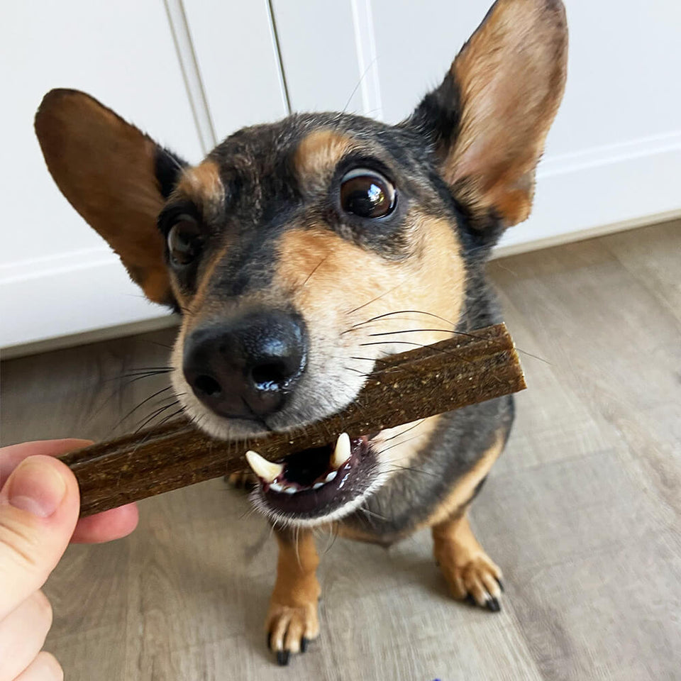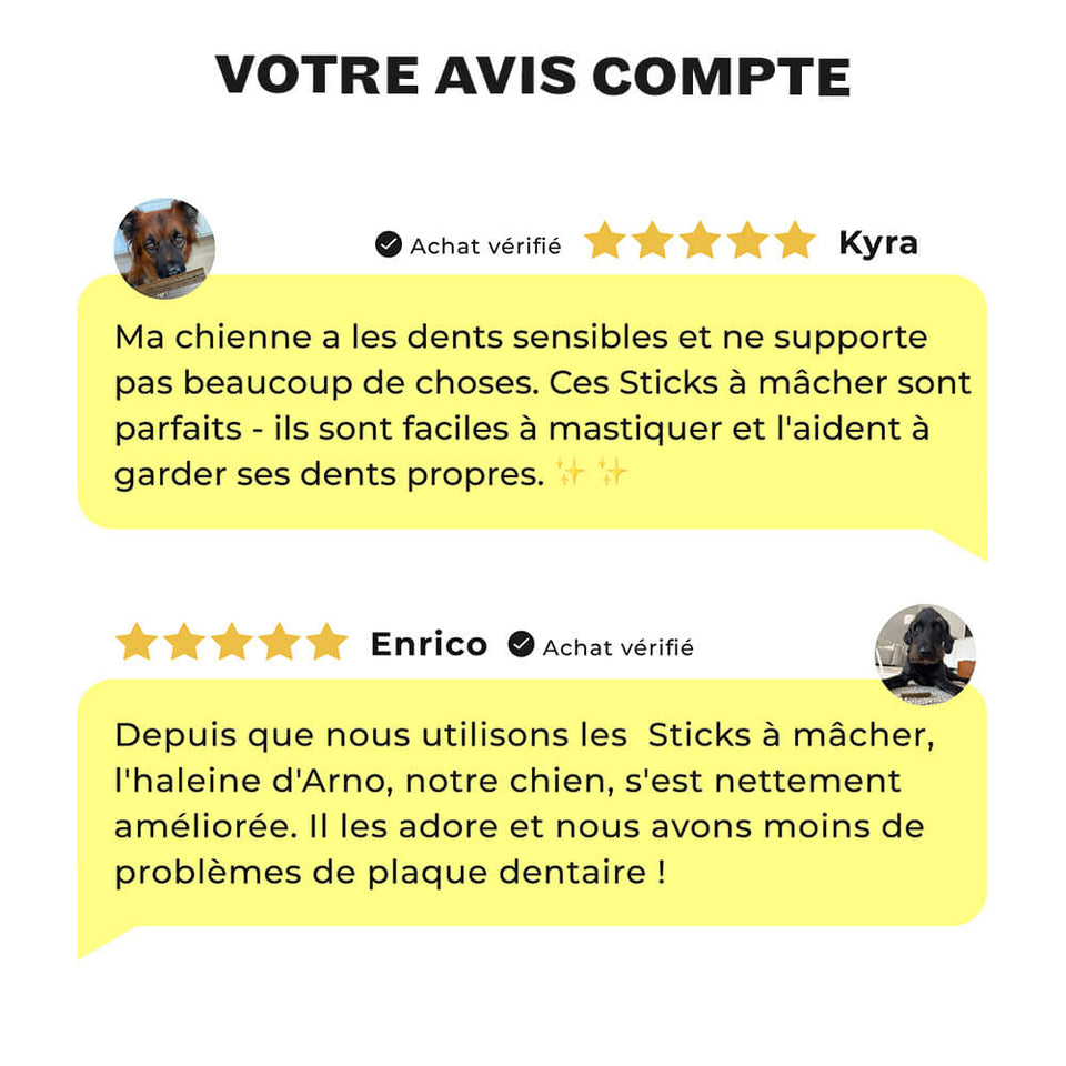 « De nombreux chiens souffrent de problèmes dentaires et de mauvaise haleine - des problèmes qui peuvent facilement être évités. Nos Sticks à mâcher ont été spécialement conçus pour réduire la plaque et le tartre tout en renforçant la santé buccale de votre chien à long terme. »