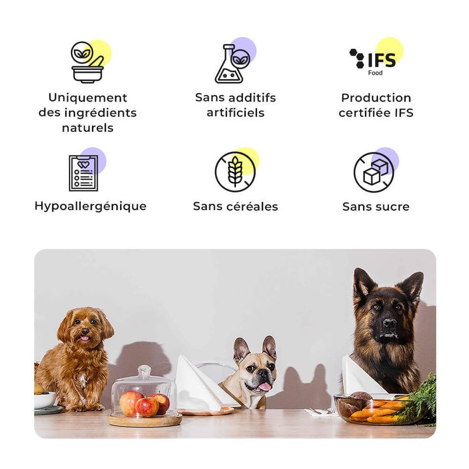 Garantie satisfait ou remboursé pendant 30 jours sans conditions si votre chien refuse ou ne tolère pas la nourriture. En savoir plus