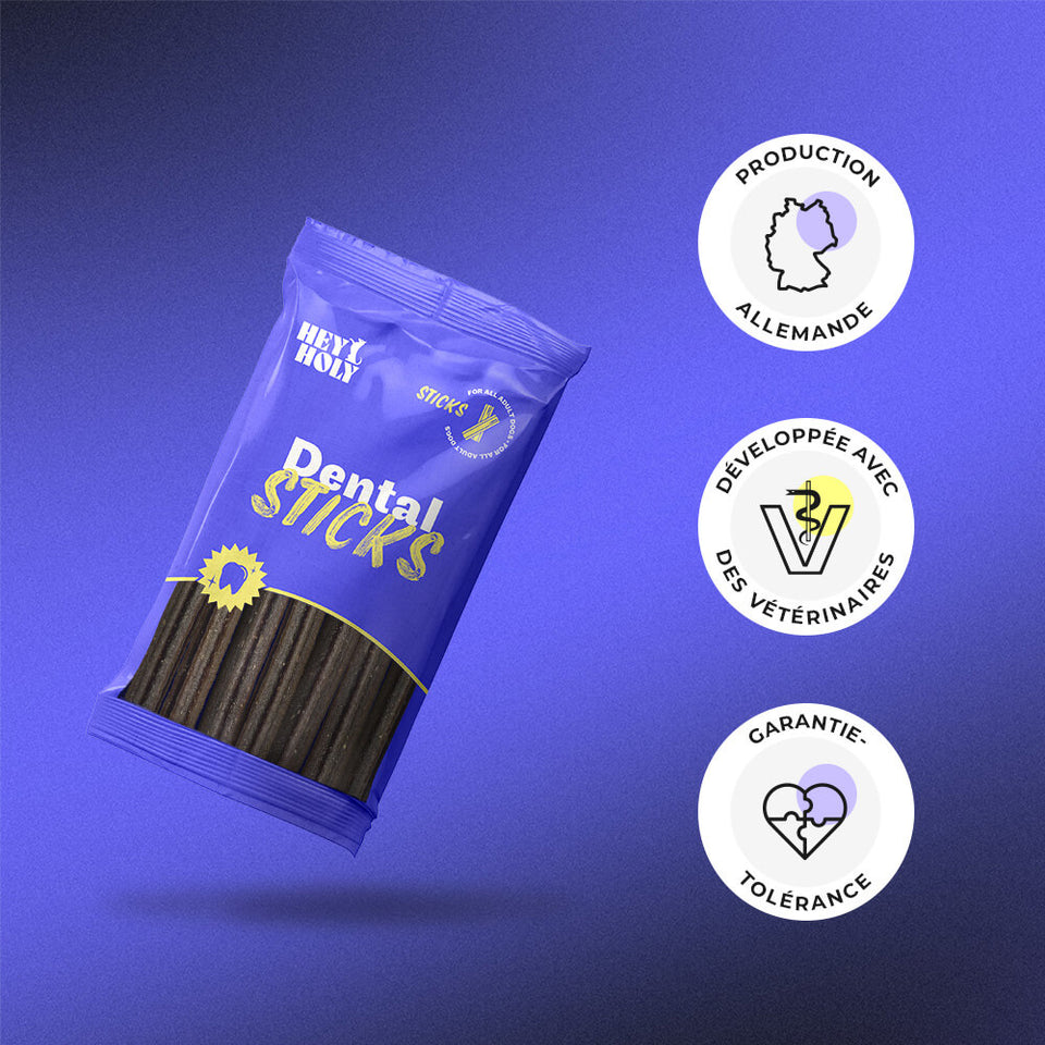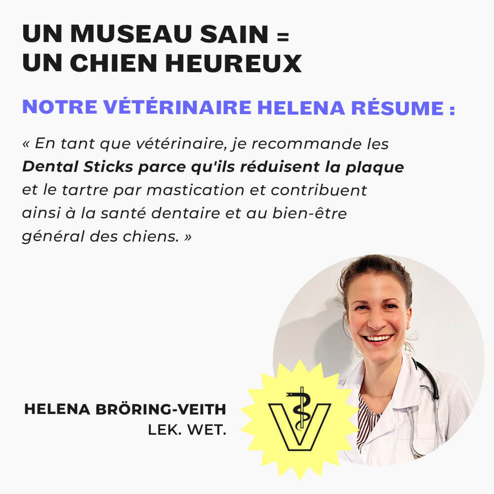 « Dans mon cabinet, je vois tous les jours des chiens qui ont des problèmes dentaires - plaque, tartre, mauvaise haleine. Ces symptômes peuvent être évités. Une bonne hygiène dentaire est essentielle pour prévenir les dommages à long terme. Les sticks à mâcher de HEY HOLY ont été spécialement conçus pour résoudre ces problèmes et soutenir efficacement la santé buccale. Chaque jour sans hygiène bucco-denntaire représente un stress inutile pour votre chien ».
