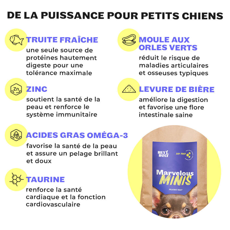 Marvelous Minis est spécialement conçu pour les races de chiens nains, comme le chihuahua, le bichon maltais, mais aussi les chiens nains croisés. Notre nourriture convient à tous les chiens adultes.