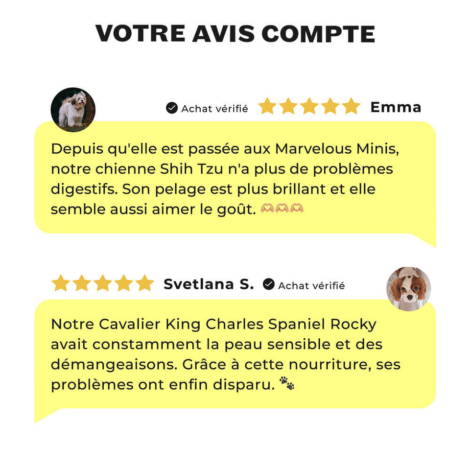 "Notre Trixie, un chihuahua de 3 ans, a toujours été extrêmement difficile et laissait souvent de la nourriture dans sa gamelle. Depuis que nous sommes passés à HEY HOLY Marvelous Minis, elle mange chaque repas avec enthousiasme. Nous sommes heureux d'avoir enfin trouvé la bonne nourriture pour elle et à ne plus avoir à en acheter une nouvelle toutes les quelques semaines. Un succès total !"