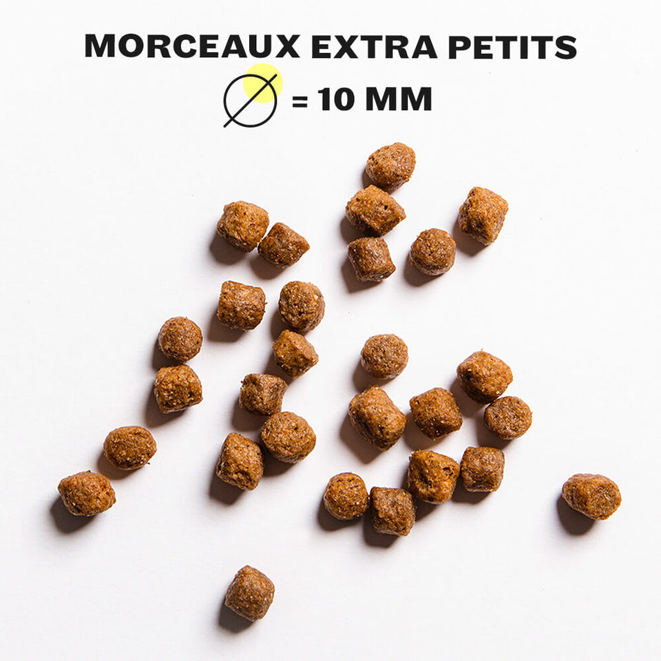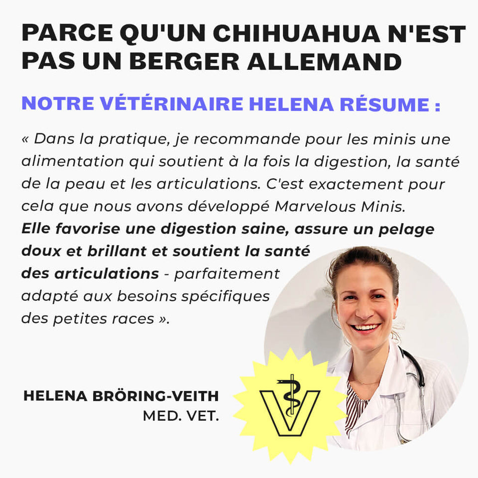 « De nombreux chiens nains sont confrontés à une digestion sensible, à des problèmes de peau et à des faiblesses articulaires. Cette nourriture spécialement adaptée permet de soulager efficacement ces troubles ».