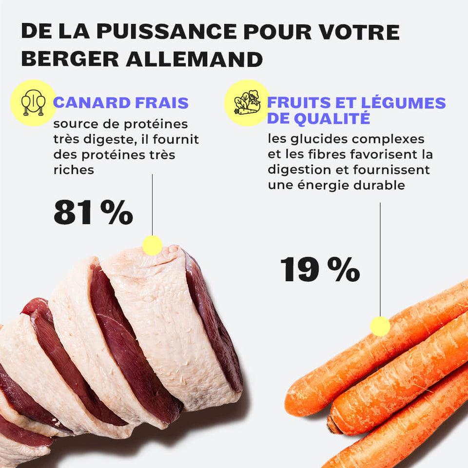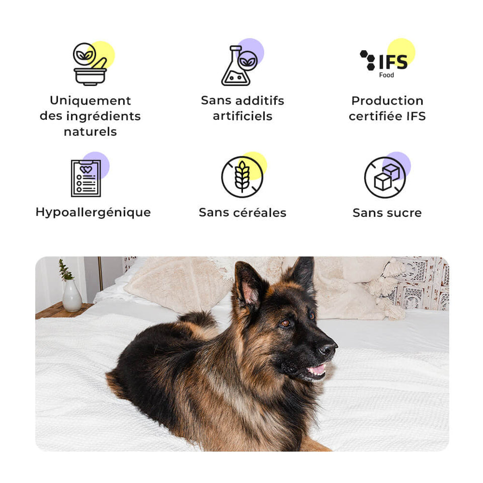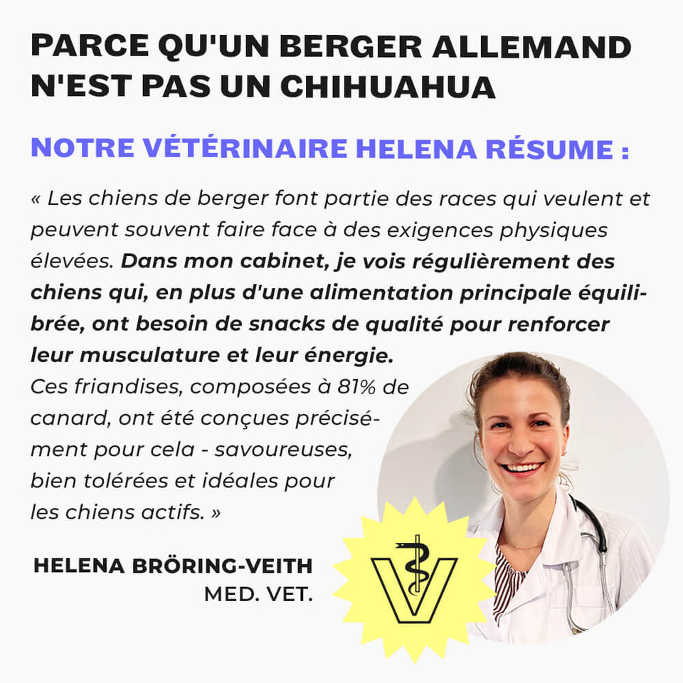 « Les bergers allemands font partie des races de chiens les plus actives et ont des besoins énergétiques élevés. Ces snacks avec 81% de viande de canard sont parfaitement adaptés à leurs besoins - comme récompense de qualité pendant l’entraînement ou tout simplement entre les repas. »
