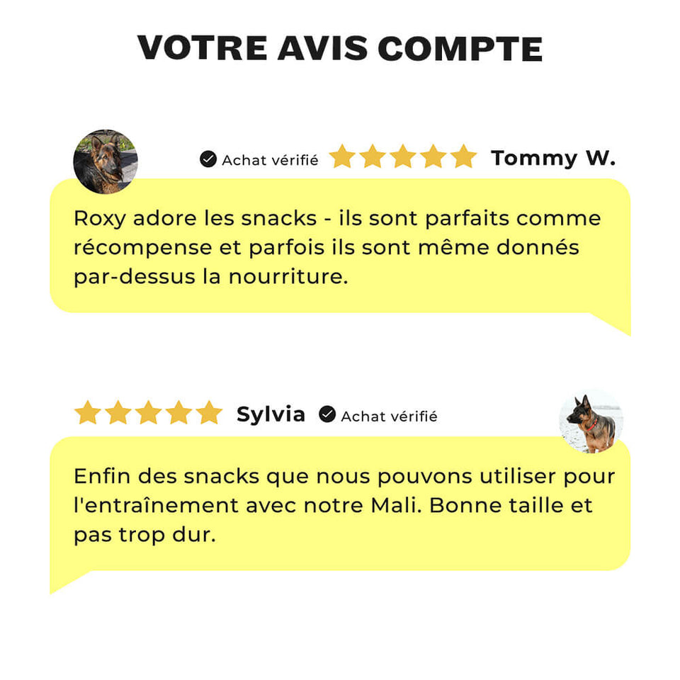 Nos snacks sont principalement composés de viande et peuvent être facilement brisés en petits morceaux si nécessaire. Ils sont donc adaptés à l’entraînement, mais peuvent également être utilisés comme récompense au quotidien.