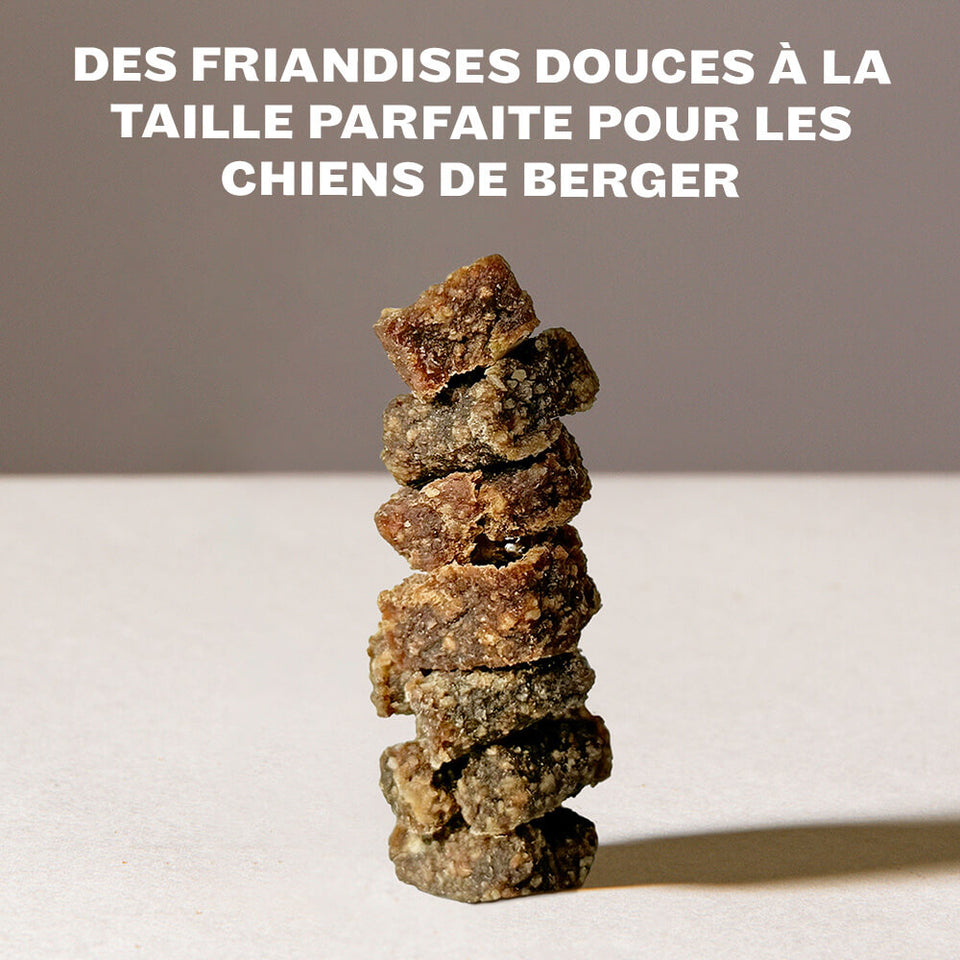 Nos friandises se caractérisent par une teneur exceptionnellement élevée en viande, les rendant parfaites pour vos sessions d'entraînement. La variété de viande utilisée dans nos friandises est la même que celle de notre nourriture, permettant ainsi une alimentation monoprotéinée complète. Cela aide à soulager le système immunitaire de votre compagnon à quatre pattes.