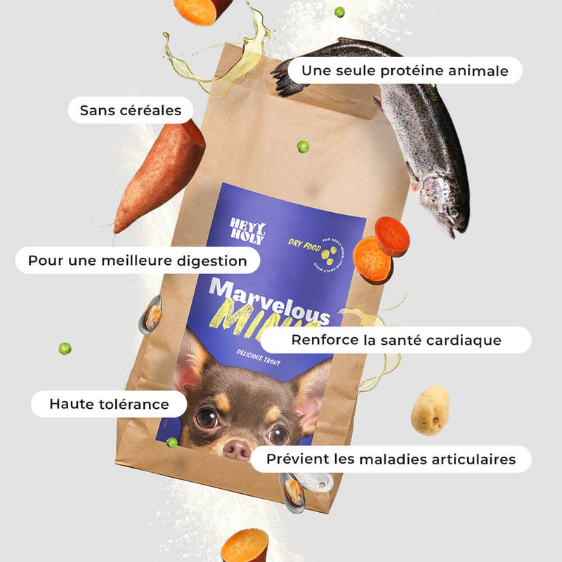 Marvelous Minis est spécialement conçu pour les races de chiens nains, comme le chihuahua, le bichon maltais, mais aussi les chiens nains croisés. Notre nourriture convient à tous les chiens adultes.