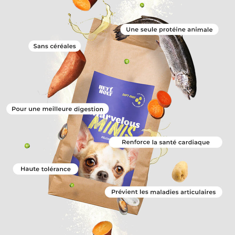 Le complément parfait ! Nos snacks Marvelous Minis sont le complément idéal à notre gamme de nourriture Marvelous Minis - Truite. Avec 80% de truite comme seule source de protéines, ils sont particulièrement savoureux et bien tolérés. Que ce soit pendant l'entraînement ou comme petite récompense entre deux, ces snacks sans céréales s'intègrent parfaitement dans le quotidien de votre mini.