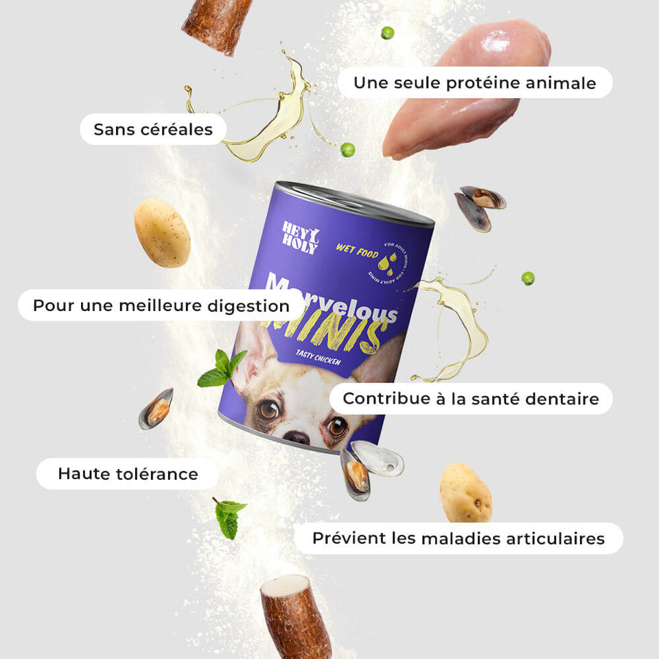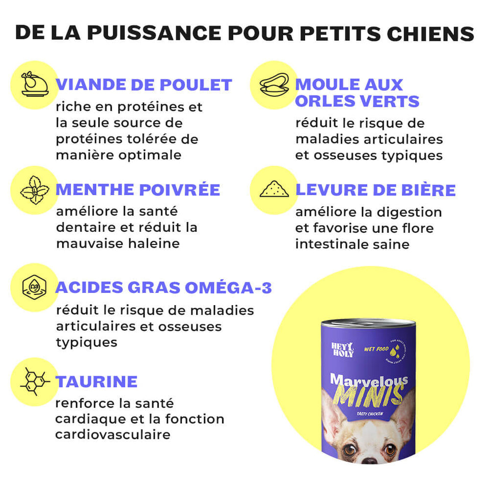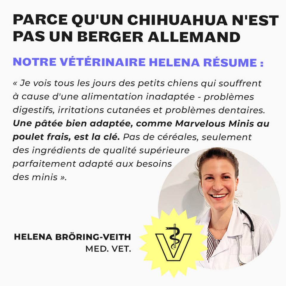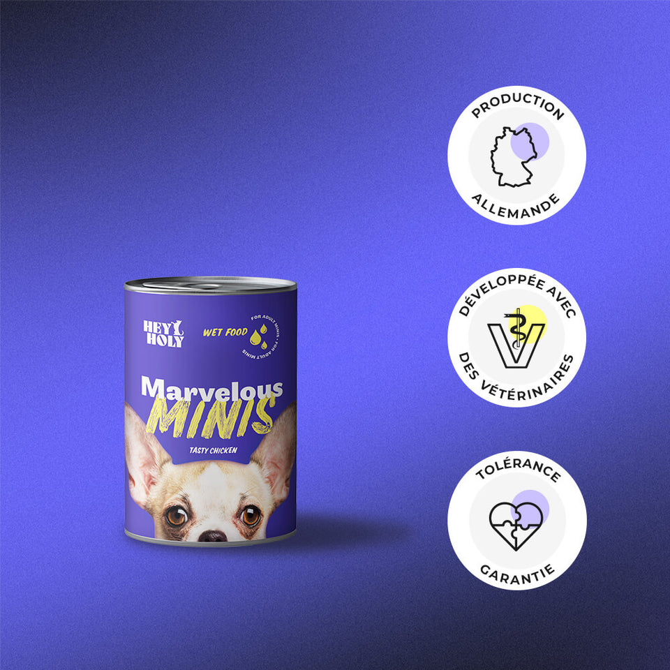 Marvelous Minis est spécialement conçu pour les races de chiens nains, comme le chihuahua, le bichon maltais, mais aussi les chiens nains croisés. Notre nourriture convient à tous les chiens adultes.