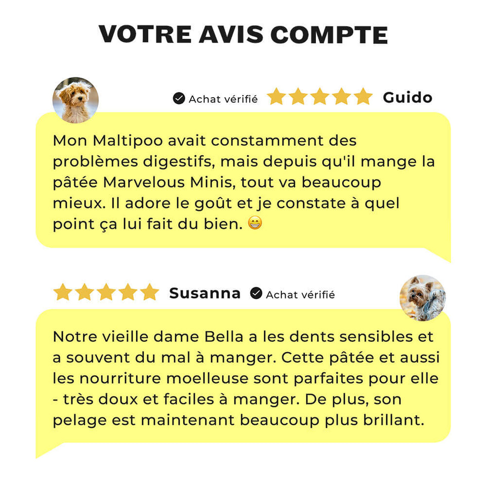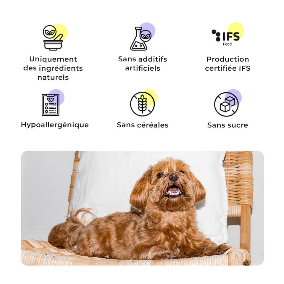 « Les petits chiens souffrent souvent de problèmes digestifs et de dents sensibles. Cette pâtée a été spécialement conçue pour stabiliser la digestion tout en favorisant la santé buccale - parfait pour les minis sensibles ».