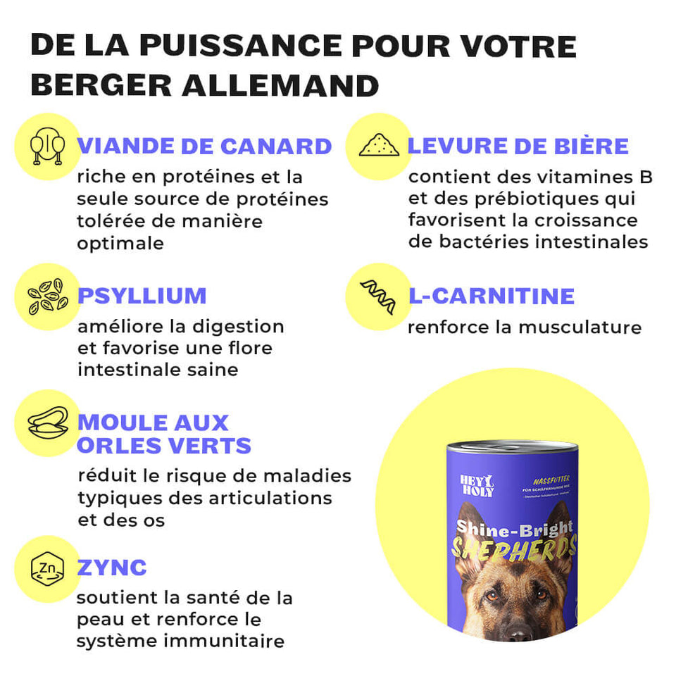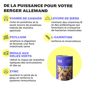 Der Protein- und Fettgehalt der Ente ist für Schäferhunde ideal und beugt als einzige Proteinquelle Unverträglichkeiten vor.