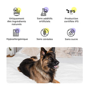 Schluss mit Verdauungsproblemen, Unverträglichkeiten und Gelenkbeschwerden. Speziell für Deutsche Schäferhunde, Malinois' und ähnliche Rassen: Frisches Entenfleisch liefert leicht verdauliches Protein und wichtige Mikronährstoffe, die die Verdauung fördern und die Gelenke unterstützen – für ein starkes, gesundes Leben.