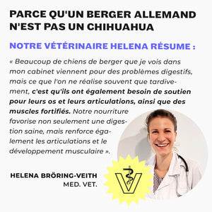 "Als Tierärztin sehe ich täglich Schäferhunde mit Verdauungs- und Gelenkproblemen und denke mir: Warum musste es so weit kommen? Unser Futter mit frischem Entenfleisch unterstützt die Verdauung und fördert gesunde Gelenke – noch bevor die Probleme beginnen."
