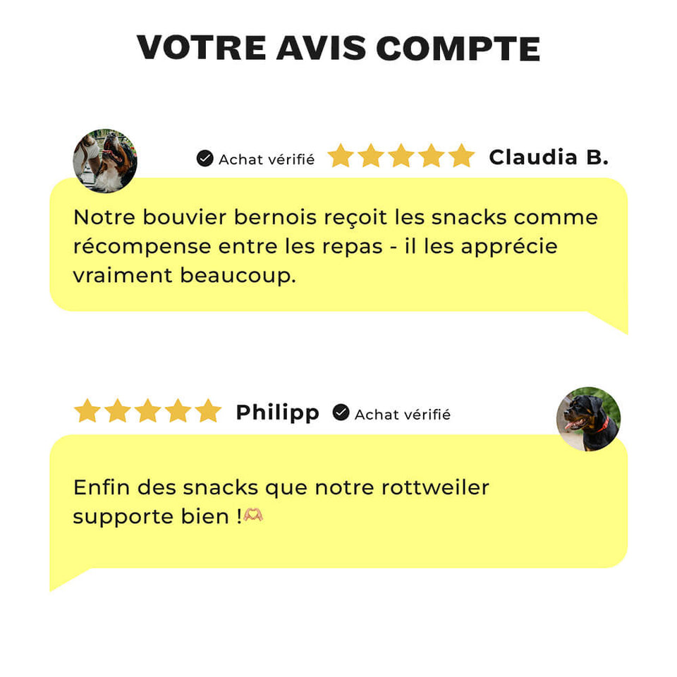 “Molosser wie Rottweiler oder Berner Sennenhunde brauchen nicht nur viel Energie, sondern auch hochwertiges Protein. Diese Snacks sind mit 88,5% frischem Rindfleisch perfekt geeignet, um sie zwischendurch zu belohnen – ohne Kompromisse bei einer hochwertigen Ernährungsweise”