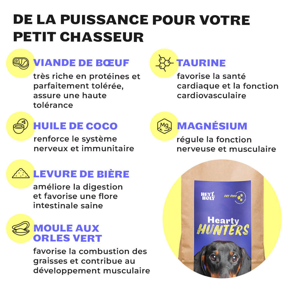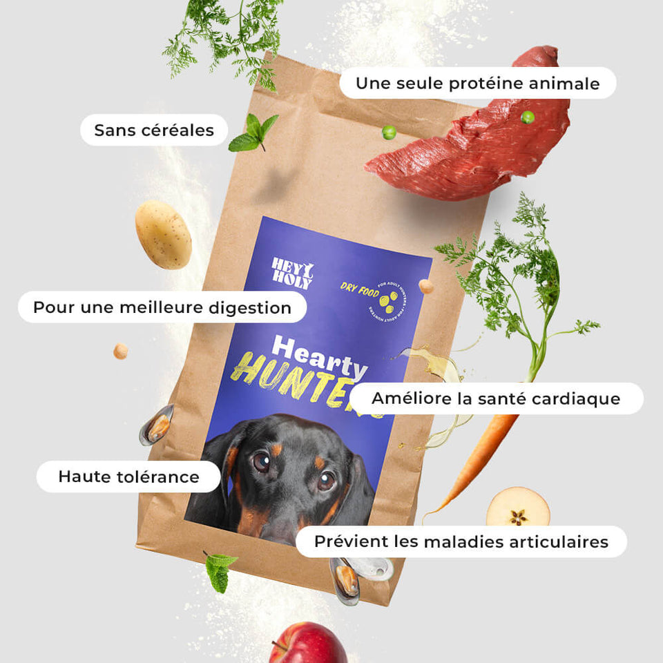 Les croquettes pour petits chiens de chasse de HEY HOLY ont été développées en collaboration avec des vétérinaires sur la base des dernières découvertes en médecine canine.