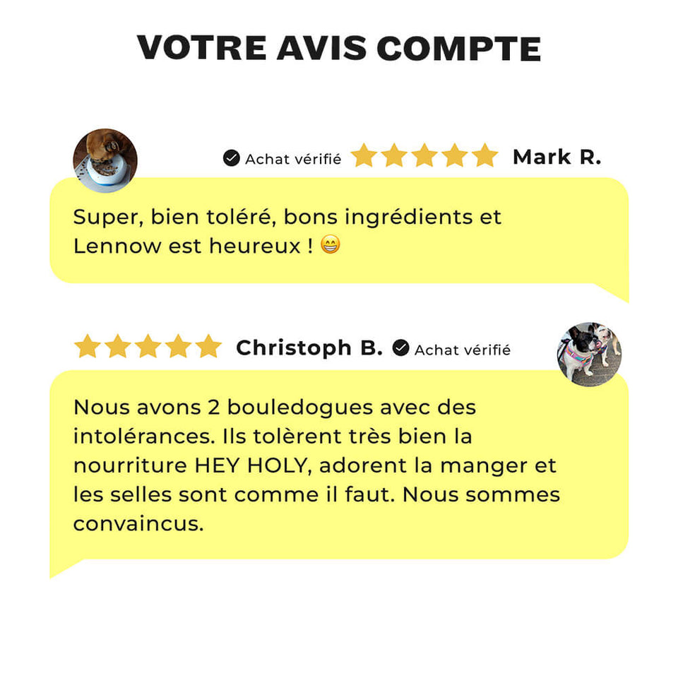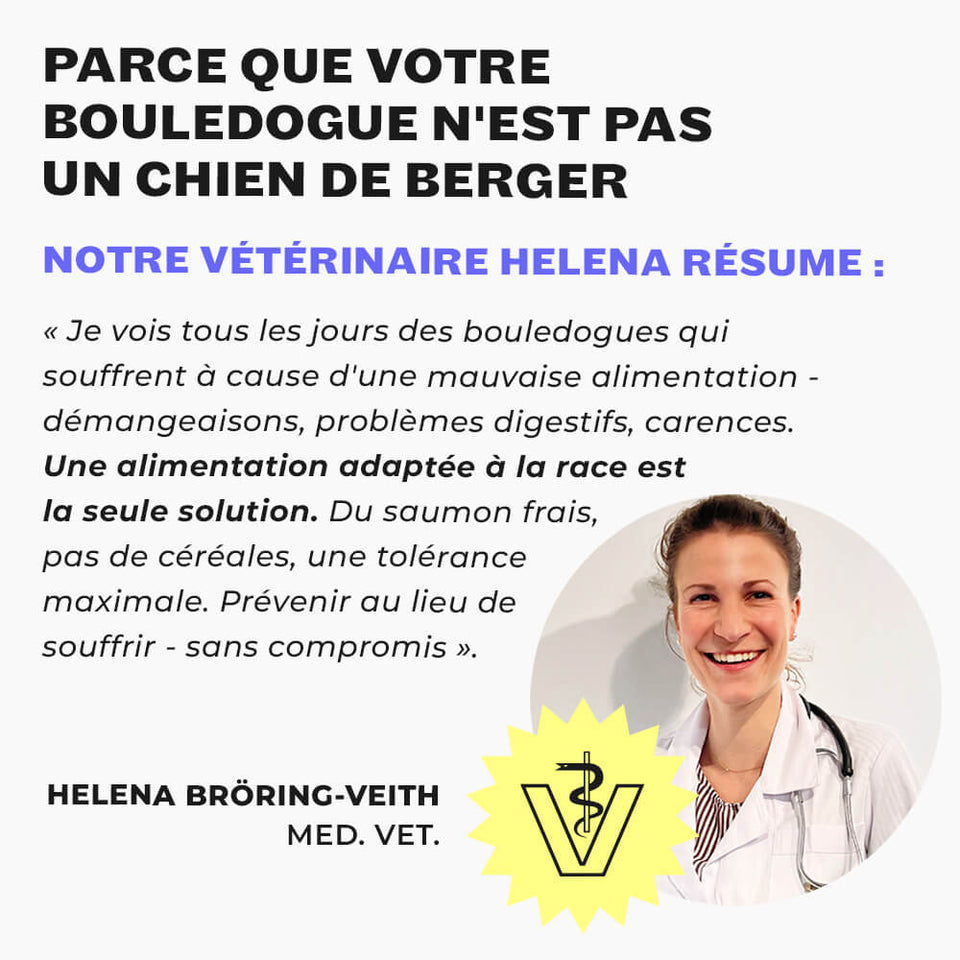 Les pâtées pour bouledogue de HEY HOLY ont été développées en collaboration avec des vétérinaires sur la base des dernières découvertes en médecine canine.