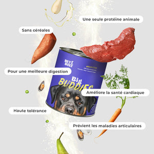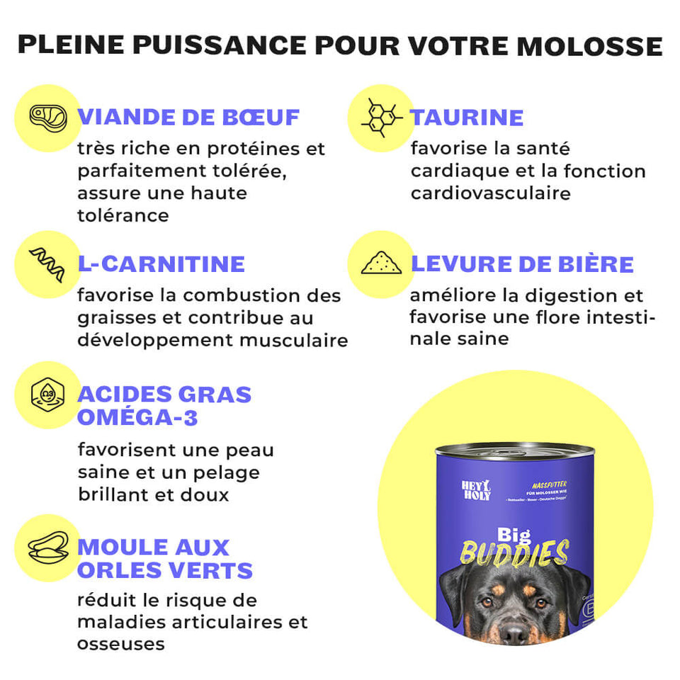 Big Buddies est spécialement conçu pour les races de molosses, comme le rottweiler, le boxer, mais aussi les molosses croisés. Cette nourriture convient à tous les chiens adultes.