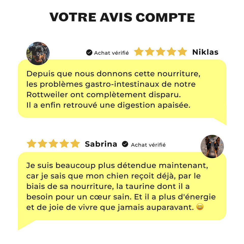 "J'ai toujours été un peu sceptique à propos des aliments purement sans céréales, car j'ai entendu dire que cela pouvait entraîner une carence en taurine. Mais HEY HOLY Big Buddies m'a complètement convaincu : c'est non seulement sans céréales, mais contient également de la taurine supplémentaire - parfait pour Bruno (Rottweiler, 5 ans) et Bella (Doberman, 3 ans). Les deux chiens adorent la nourriture, leur digestion est excellente et je remarque à quel point ils sont en forme. Nous allons certainement continuer!"