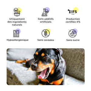 Garantie satisfait ou remboursé pendant 30 jours sans conditions si votre chien refuse ou ne tolère pas la nourriture. En savoir plus