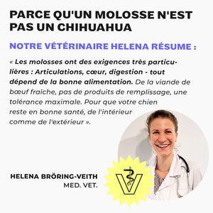 « De nombreux molosses souffrent de problèmes gastro-intestinaux, d'intolérances ainsi que de troubles articulaires et cardiaques - mais ce n'est pas une fatalité ! Nos croquettes aident à soulager ces symptômes ».